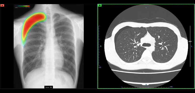 AIが画像を解析し、肺がん(結節・腫瘤)や肺炎(浸潤影)、気胸などの異常が疑われる場所を検出します。検出された領域を医師が再確認しながら診断を行うことで、従来の検査と比べて、精度の高い診断が可能になります。